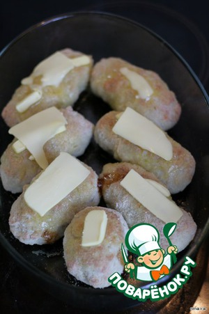 Когда котлетки начнут зарумяниваться, положить сверху по кусочку сливочного масла и оставить на несколько минут. При желании можно так же посыпать тертым сыром