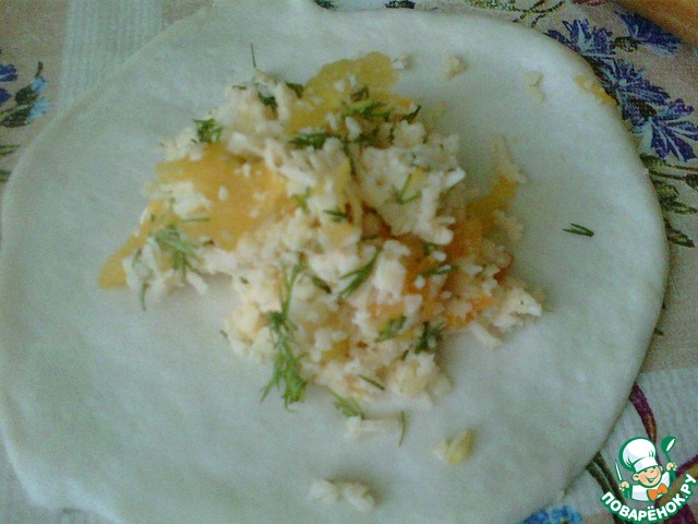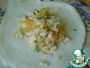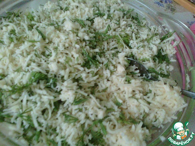 В начину сыр трем мелкой терке, туда же добавляем укроп и пропущенный через пресс чеснок, все перемешать