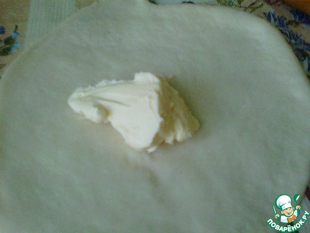 Для начала готовим тесто. В тёплом молоке растворяем дрожжи с сахаром, добавляем яйцо, соль, размягчённое сливочное масло, муку и замешиваем тесто.