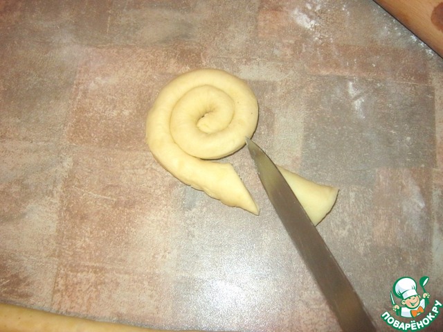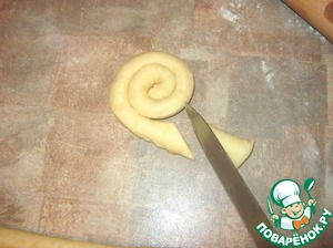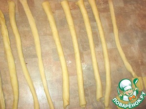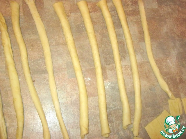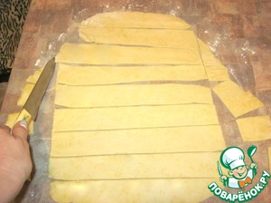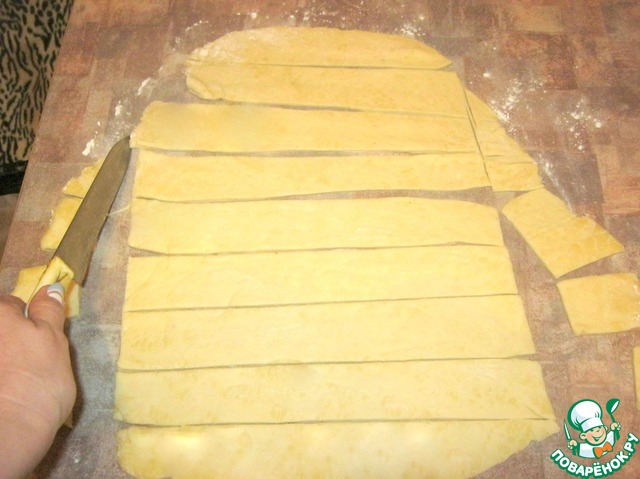 После этого раскатала в прямоугольник и нарезала на полоски примерно 5-7 см.
