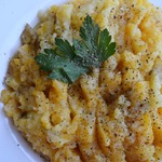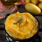 [+4]У меня получилось на 10 картофелин (около 1,5 кг) 1 небольшая тыква сорта "Баттернат". Овощи варила раздельно, не очищая от кожуры. Разминала в пюре толкушкой, не блендером. Молока добавила 200 мл. Масло, соль и сахар не использовала.