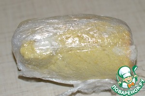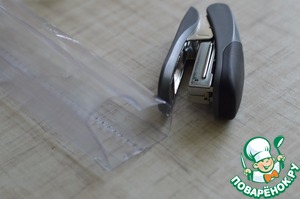 2. Один край плотно закрыть пищевой пленкой, форму поставить в стакан.