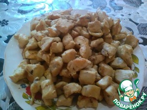 Режем куриную грудку на мелкие кубики. заливаем масло в сковороду и жарим на большом огне, постоянно помешивая, до готовности. Солим и перчим по вкусу.