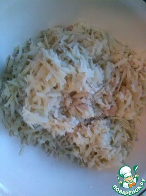 Отвариваем картофель за ранее, чистим его. когда остынет, ставим в холодильник на часок (чтоб не прилипал когда будем тереть. Ну и остальные ингридиенты