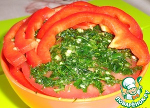 В подготовленную форму слоями выкладываем овощи: помидор/зелень/перец /зелень и т. д.