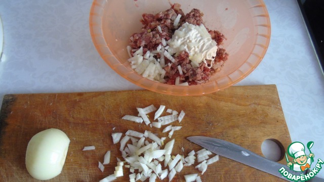 Делаем фарш. Смешиваем фарш, соль, перец, мелко нарезанный лук и добавляем немного майонеза (столовую ложку).