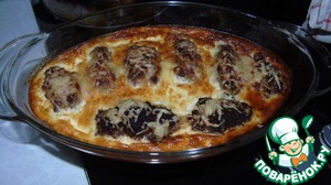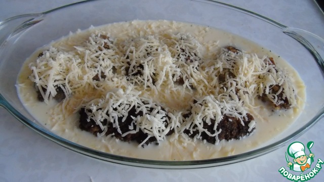 Заливаем котлеты полученной смесью из яиц, посыпаем сверху тертым сыром.