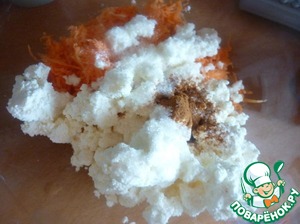 Для начинки перемешать творог, сметану, корицу, сахар, изюм и морковный жмых. Если творог зернистый, то лучше его предварительно взбить со сметаной.