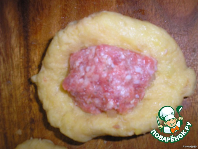 Из картофельного теста сформировать лепeшки, начинить их фаршем. Края лепешки закрыть так, чтобы не было видно стыков.