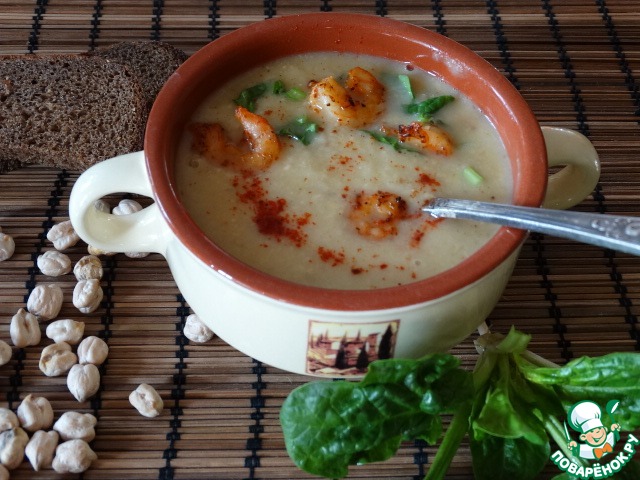 Поставить на маленький огонь, добавить сливки и довести до нужной густоты. Креветки обжарить с перцем минут 5 и добавить к супу.