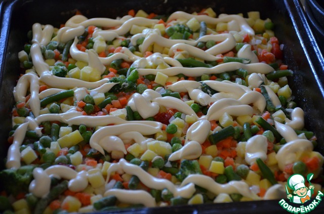 Солим овощи и промазываем майонезом. Ставим в духовку на 20-25 мин.