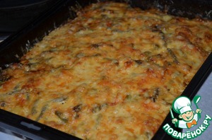 Снова вынимаем противень и посыпаем запеканку сыром. Держим до золотистой корочки.