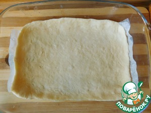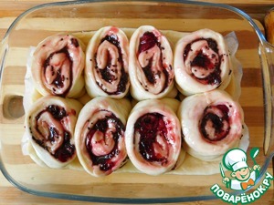 Выкладываем получившиеся рулетики в форму для выпечки, дно которой мы ранее выстлали тонко-раскатанным тестом.