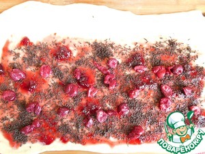 Половину вишнёвого джема распределяем на раскатанном тесте, немного не доходя до краёв с трёх сторон.