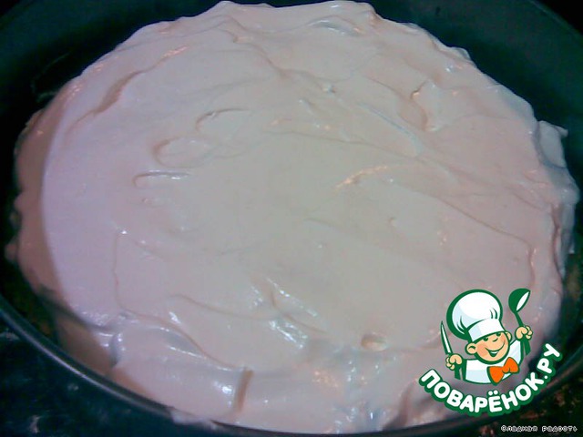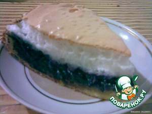 Затем взбить белки (холодные) и добавить сироп, который надо сварить из сахара и воды, пока он не начнет густеть. Выложить белки на пирог и снова положить в духовку на 5 -7 минут, на 200 градусов.