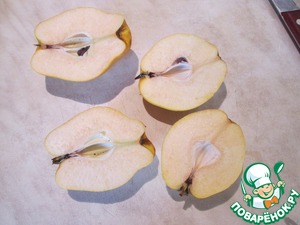 Айву вынуть из воды, слегка обсушить, нарезать кусочками и обжарить в 3 - х столовых ложках растительного масла до зарумянивания.