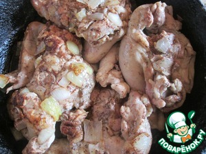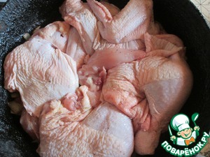 Выложить части цыпленка на сковороду к луку кожей вверх, накрыть крышкой и тушить 15 - 20 минут. Если будет мало жидкости, можно добавить немного воды.