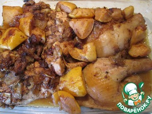 Теперь вернемся к мясу. Кусочки цыпленка переложить в емкость для запекания. Мед размешать с соком 2 - го лимона, вылить в сковороду, где тушился лук и мясо, туда же выложить айву. Тушить, помешивая, до размягчения айвы. У меня айва хорошо проварилась и была достаточно мягкой, поэтому тушила я несколько минут для того, чтобы соединились ингредиенты. Выложить содержимое сковороды на мясо и поставить в разогретую до 180 градусов духовку на 10 - 15 минут. Готово! Блюдо получается насыщенным, с ярким пряным и сладковатым медовым вкусом.