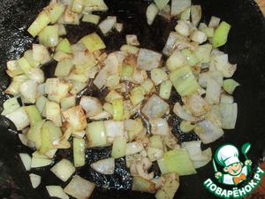 Лук очистить, порезать крупно, жарить в 3 - х столовых ложках растительного масла с добавлением корицы и имбиря в течении 5 - 10 минут на маленьком огне.