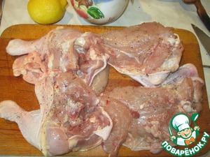 Пока жарится лук, займемся мясом. Разрезать тушку цыпленка на четыре части и вырезать кости из всех кусков, кроме крылышек и голеней, посолить, поперчить.