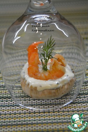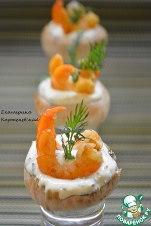 Начинить шляпки соусом и вставить по 2 королевские креветки, украсить зеленью укропа. Убрать в холодильник буквально на 10-15 минут охладиться!