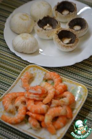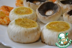 Шампиньоны помыть, обсушить бумажным полотенцем и удалить ножки. Креветки отварить и очистить. В этот раз я их очистила и припустила на сковороде вместе с шампиньонами на оливковом масле до подрумянивания.