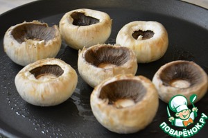 Сковороду накалить, сбрызнуть оливковым маслом и поджарить грибы с одной стороны. Жарить не больше 2х минут, чтобы грибы не пустили сок.