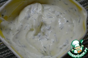 Делаем соус:смешать сметану, майонез, чеснок через пресс, измельченный укроп и свежемолотый перец.