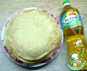 • Блинчик намазать соусом, положить столовую ложку начинки и сложить конвертиком.
