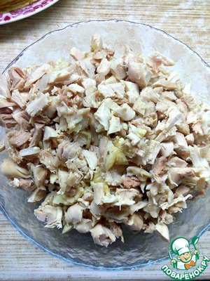 • Курицу (или части) отварить в подсоленной воде, остудить и порезать на кусочки. Вместо курицы можно использовать любую начинку.