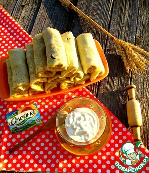 Перед подачей блины можно поджарить или подогреть в микроволновке, чтобы сыр расплавился.