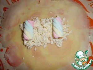 Начинаем выкладывать начинку. По центру распределяем 1 ст. л. творога.