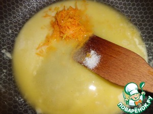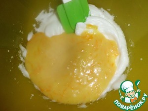Так же отправляем туда сок, цедру апельсина и сахар, тщательно "разбиваем" лопаточкой, чтобы не образовались комочки.