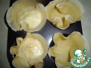 В формочки для кексов укладываем блинчики и заполняем их получившейся массой.