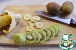 Банан и киви почистить, нарезать тонкими ломтиками.