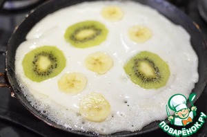 налить тесто, сразу выложить кусочки фруктов. как блин поджариться, переворачиваем на другую сторону.