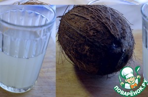 Из кокоса слить молоко, если молока получилось меньше стакана, долейте в кокосовое молоко, коровье.