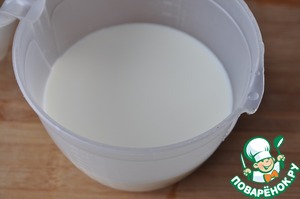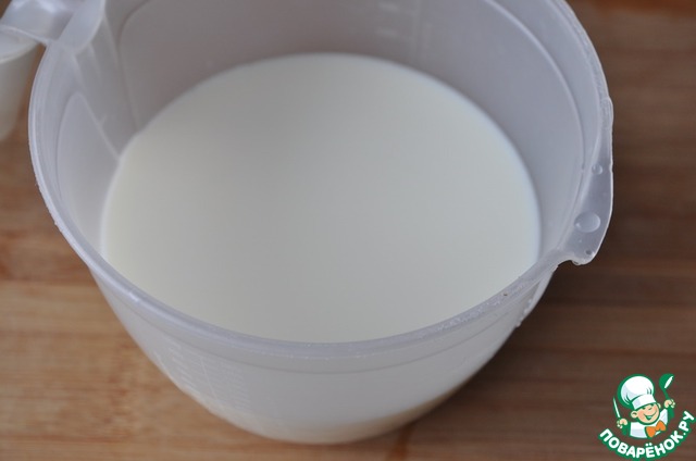В ёмкости, удобной для взбивания, смешиваем тёплое молоко и воду.