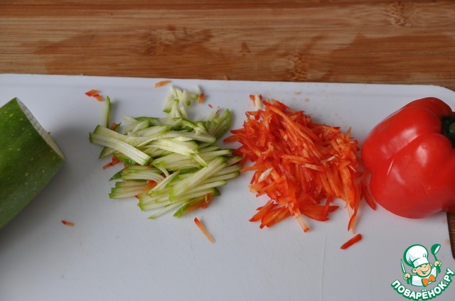 Берём цуккини и болгарский красный перец, моем, перец чистим и очень тонко всё нарезаем соломкой или натираем на тёрке.