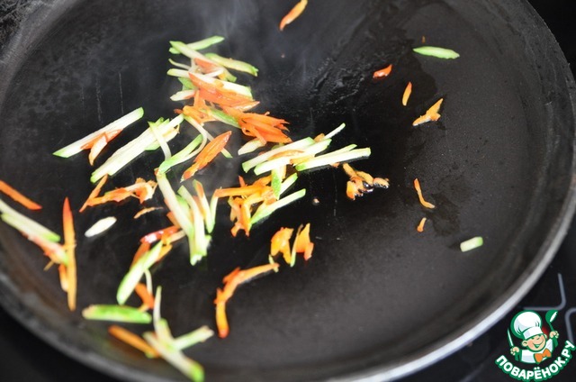 Кладём столовую ложку смеси из болгарского перца и цуккини и быстро обжариваем несколько секунд. Сковорода должна быть горячей.