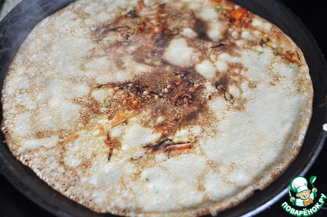 Как только блин "схватится" сверху, аккуратно переворачиваем и печём с другой стороны ещё около 30 секунд.