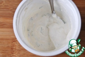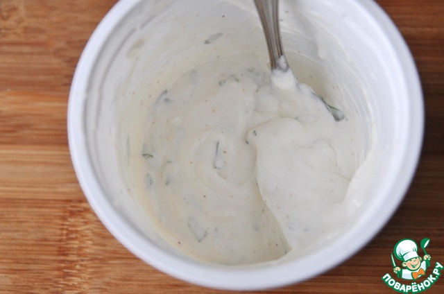 К сметане добавляем соль, перец чили, выдавленный чеснок и мелкорубленную зелень кинзы. -