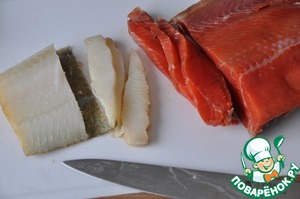 Тонкими слайсами нарезаем филе (без шкуры и костей) малосольного лосося (у меня нерка) и палтуса холодного копчения.