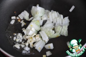 Кладём порезанные кубиками лук и чеснок и обжариваем пару минут до прозрачности.
