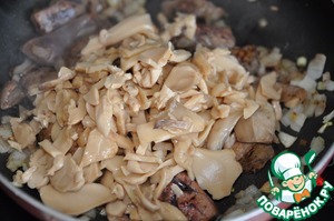 Добавляем порезанные шампиньоны, у меня варёные, обжариваем 5 минут.