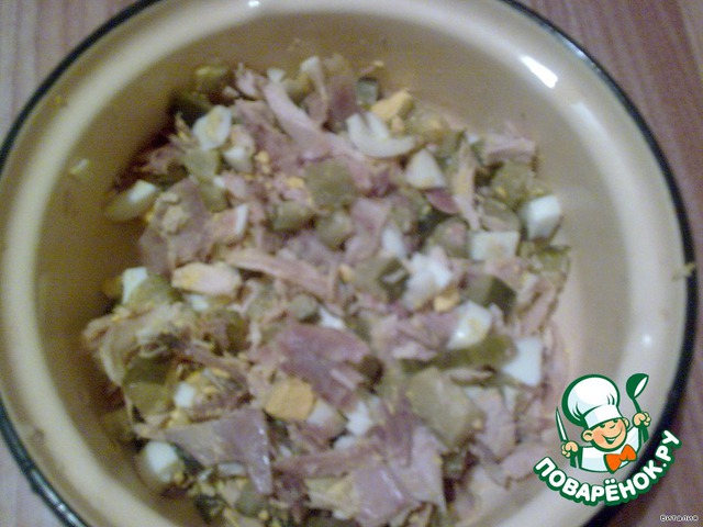 Все смешать, добавить чеснок, выдавленный через чесночницу, заправить майонезом.