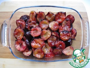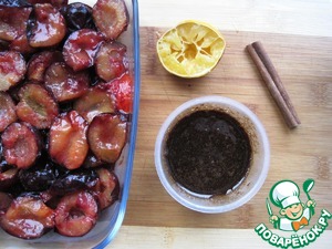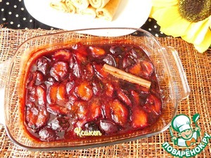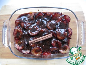 Заливаем полученной смесью сливы, добавляем палочку корицы и ставим в разогретую духовку на 30 минут.