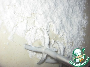 Просеянную муку смешайте с тёплым молоком, туда же всыпьте дрожжи -