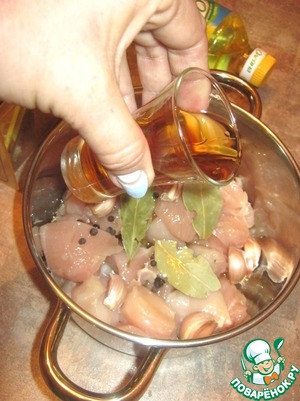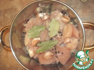 Вымытый просушенный чеснок, лавровый лист, горошины чёрного перца соединить с курицей. -