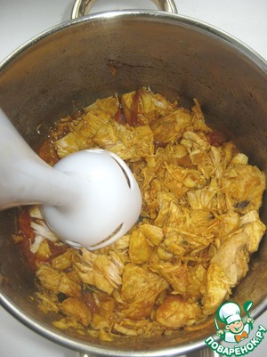 Конфи пробила блендером, я люблю конфи или небольшими кусочками или небольшими волокнами-для оладьев я выбрала второй вариант.
